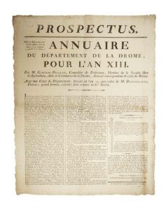 DRÔME. «PROSPECTUS. ANNUAIRE du Département de la DRÔME, pour l'An XIII.» par M. Gueymar-Dupalais, Conseiller de Préfecture, Membre de la Société libre d'Agriculture, Arts et Commerce de la Drôme, associé correspondant de celle du Rhône. Avec la CARTE du Département, dressé en l'an 12 (1804), par ordre de M. DESCORCHES Préfet; grand format, colorié; fort volume in-8° broché... Formule de souscription...» - Impr. à VALENCE, de l'Imprimerie de Marc AUREL -