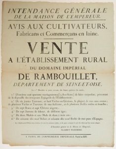 DOMAINE IMPÉRIAL DE RAMBOUILLET (78). 1805. Intendance générale de la Maison de l'Empereur. Avis aux Cultivateurs, Fabricants et Commerçants en laine, d'une vente à l'établissement rural du Domaine impérial de Rambouillet, Département de Seine-et-Oise, le 1er Messidor (An XIII); de laine provenant des troupeaux Espagnols de l'établissement, de taureaux, vaches, boucs, chèvres, juments de labour, mulets, béliers et brebis.
