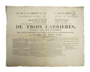 «De par Sa Majesté l'Empereur et Roi (Napoléon), adjudication définitive le 4 Octobre 1809, à l'audience des criées du tribunal du Département de la Seine, à Paris, de trois Carrières, Ports et accessoires, situés terroir de GOUVIEUX, près CHANTILLY, Canton de CREIL, Département de l'OISE, à vendre en trois lots - De l'Imprimerie d'Everat, rue Saint-Sauveur, n°41. - Affiche timbrée (42 x 54) État A. Défaut d'impression original.
