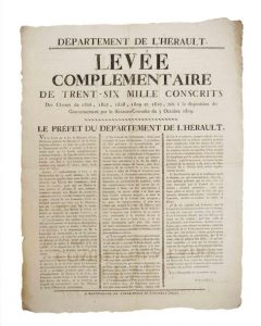 HÉRAULT. 1809. GRANDE ARMÉE. «LEVÉE complémentaire de 36000 Conscrits des Classes de 1806, 1807, 1808, 1809 et 1810, mis à la disposition du Gouvernement par le Sénatus-Consulte du 5 Octobre 1809.» NOGARET Préfet de l'Hérault - Fait à MONTPELLIER (34) le 16 Octobre 1809 - Impr. à Montpellier, de l'Imprimerie de FONTENAY-PICOT.