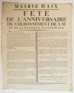 COURONNEMENT DE NAPOLÉON & BATAILLE D'AUSTERLITZ. 1810. AIX (13) «Fête de l'Anniversaire du Couronnement de Sa Majesté et de la Bataille d'Austerlitz.» Arrêté fait à Aix (13) le 27 Novembre 1810. (Fête, cérémonies, Mariage de la Rosière, distribution de pain, cortège...)