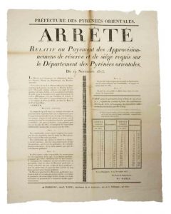 PYRÉNÉES ORIENTALES. 1813. «Arrêté relatif au payement des approvisionnement de réserve de Siège requis sur le Département des Pyrénées Orientales.» Du 19 Novembre 1813 - Impr. à PERPIGNAN, chez P. TASTU, imprimeur de la Préfecture, 2370 rue de la Préfecture.