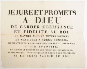 PRESTATION DE SERMENT DE FIDÉLITE AU ROI (retour des Bourbons 1814) «JE JURE et promets à Dieu de garder obéissance et Fidélité au Roi, de n'avoir aucune intelligence, de n'assister à aucun conseil, de n'entretenir aucune ligue qui serait contraire à son autorité; et si dans le ressort de mes fonctions, ou ailleurs, j'apprends qu'il se trame quelque chose à son préjudice; je le ferai savoir au Roi.»