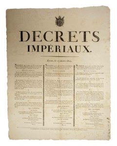 PREMIERS «DÉCRETS IMPÉRIAUX» des CENT-JOURS de NAPOLÉON, LYON le 13 Mars 1815 - «LA GARDE IMPÉRIALE est rétablie, les GARDES-SUISSES sont supprimés....; Séquestre sur les Biens des Princes de la Maison des BOURBONS....; LA NOBLESSE EST ABOLIE, les titres féodaux sont supprimés...» signé (impr.) NAPOLÉON, & BERTRAND Le Grand-maréchal, faisant fonction de major-Général de la Grande Armée - Impr. à CLERMONT (63), de l'Imprimerie de Landriot, imprimeur de la Préfecture, et Libraire, grande rue St-Genès. - Vignette à l'Aigle impérial (Napoléon débarque en France le 1er mars 1815, et arrive à Paris le 20 mars 1815)