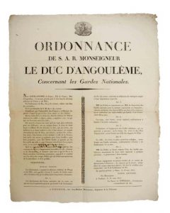 «Ordonnance de S.A.R. Monseigneur LE DUC D'ANGOULÊME (Louis-Antoine), Lieutenant général pour le Roi dans les Divisions militaires de l'Ouest et du Midi, relatives aux Gardes Nationales. Au Quartier-général à NÎMES (30) le 28 Mars 1815 & Publié à TOULOUSE (31) le 30 Mars 1815, Le Baron De VITROLLES, Commissaire extraordinaire du Roi - Vignette Royale -