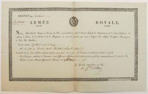 ARMÉE ROYALE. 1815. MAINE-ET-LOIRE. Brevet signée «Le Chevalier d'ANDIGNÉ» Général Commandant en Chef l'ARMÉE ROYALE. Brevet de Capitaine, aide de Camp pour Mr le Marquis de CARADEUC DE LA CHALOTAIS (Raoul-Marie) - Donnée en notre quartier-général de POUANCÉ (49), le 24 Mai 1815.