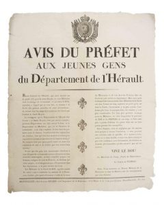 HÉRAULT. 4 Placards concernant la GARDE NATIONALE de 1816 à 1817, imprimés à MONTPELLIER, chez Auguste RICARD: 1°) Avis du Comte de FLOIRAC Préfet du Département de l'Hérault, Maréchal de Camp, Aux Jeunes Gens.» - Fait à Montpellier le 23 Juillet 1816 - pour l'enrôlement volontaire dans la GARDE ROYALE. (53 x 44) + 2°) Avis du Préfet de l'Hérault, Maréchal de camp, à ses administrés au sujet de l'enrôlement pour les Régiments de grenadiers à Cheval et de Cuirassiers de la GARDE ROYALE. Fait à MONTPELLIER le 26 Octobre 1816. (44 x 27) + 3°) Adresse du Comte de FLOIRAC Préfet, Maréchal de Camp, aux Jeunes Gens du Département de l'Hérault, pour les inciter à s'enrôler dans la GARDE ROYALE. Vive le Roi ! (1817). (53 x 44) + 4°) Le Comte de FLOIRAC Préfet du Département de l'Hérault, Maréchal de Camp, invite à l'enrôlement volontaire pour les Régiments de Grenadiers à cheval et de Cuirassiers de la GARDE ROYALE. - Fait à Montpellier le 21 Avril 1817. (53 x 44)