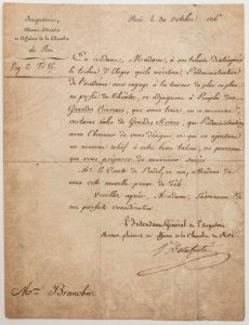 MENUS-PLAISIRS DU ROI. Paris 30 Octobre 1816. Lettre signée PAPILLON DE LA FERTÉ (Fils) l'Intendant Général de l'Argenterie, Menus, plaisirs et Affaires de la Chambre du Roi, à Madame BRANCHU (Caroline BRANCHU, Chanteuse, Artiste Lyrique, Actrice, Maîtresse de Napoléon 1er). «En rendant, Madame, à vos talents distingués le tribut d'éloges qu'ils méritent, l'Administration de l'académie vous engage à les tourner de plus en plus au profit du théâtre, en adjoignant à l'emploi des Grandes Princesses, que vous tenez, en ce moment, certains rôles de Grandes Reines, que l'administration aura l'honneur de vous désigner, et qui ajoutant un nouveau relief à votre talent, ne pourront que vous préparer de nouveaux succès. Mr le Comte de PRADEL, et moi, attendons de vous cette nouvelle preuve de zèle.» - 1p in-4°.