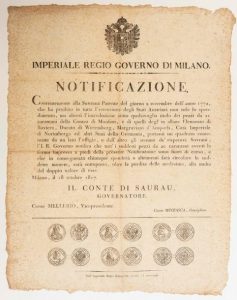MILAN. 1817. MONNAIES AUTRICHIENNES. Avis du comte de SAURAU Gouverneur Autrichien du Gouvernement Royale et Impériale de MILAN. (Milan est sous la domination de l'Autriche) concernant l'interdiction de certaines monnaies Autrichiennes. MILAN (Italie) le 18 Octobre 1817. Texte en Italien.