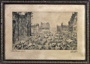 De Bruycker, Jules (Gand 1870-1945).- (L.R. 007). Place Ste-Pharaïlde - St-Veerleplein, 1906. Eau-forte, cuv. 22 x 37 cm + marges, sur vergé, signée et datée 1906 en bas à g. dans le champ, titrée en bas à g. "Place Pharailde à Gand" et...