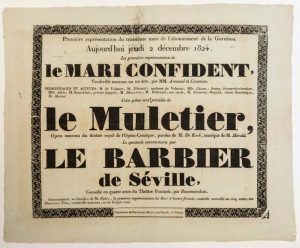THÉÂTRE D'ORLÉANS. 1824. LE BARBIER DE SÉVILLE de BEAUMARCHAIS. «Première représentation, aujourd'hui 2 Décembre 1824, de LE MARI CONFIDENT, Vaudeville nouveau en un acte, par MM Armand et Constant... Cette pièce sera précédée de LE MULETIER, Opéra nouveau du théâtre royal de l'Opéra-Comique... Le Spectacle commencera par LE BARBIER DE SÉVILLE, Comédie en quatre actes du théâtre Français, par BEAUMARCHAIS.» Imprimerie de Danicourt-Huet, rue Royale, à Orléans.