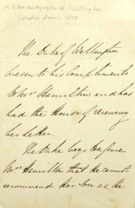 Lettre Autographe à la troisième personne, en anglais, de LONDRES le 8 mars 1829 - «The Duke of WELLINGTON» présente ses compliments à M. HAMILTON mais il ne peut pas recommander son fils qu'il ne connaît pas personnellement. 1p in-8°.