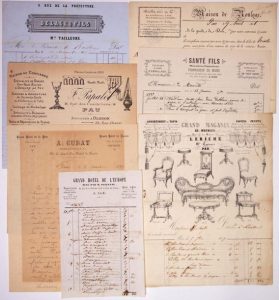 Roulage MÉRILLON Ainé et Cie, rue de la Préfecture, à PAU 1831 + Grand Magasin de meuble 15 rue de la Mairie, LERICHE Marchand Tapissier à PAU; Facture de 1847. (Grande Illustration.) + Facture «Grand Hôtel de l'Europe» tenu par M. PELLANNE, en face de la Préfecture et de la Poste aux lettres à PAU 1856 + Facture DELAGE & Fils Marchands Tailleurs, 9 Rue de la Préfecture à PAU 1856 + Lettre à en-tête Grand Hôtel de la Paix, Place Royale à PAU 1889. L.S. A. CUBAT Ex-Maître d'Hôtel de S.A.I. le Grand-Duc Michel de Russie + Facture SANTÉ Fils, Menuisier-Emballeur, Fournisseur du Musée et de la Société des Amis des Arts, 10 rue de Lamothe, à PAU 1890 + Lettre à en-tête F. PAPALET, Dorure et argenture, Ornements d'églises, horlogerie, lunetterie, 10 rue des Cordeliers à PAU 1900.