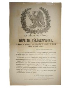 VICTOIRE DE SÉBASTOPOL 10 Septembre 1855. «Nouvelles de CRIMÉE. Dépêche télégraphique du Général PÉLISSIER, Crimée 10 septembre 1855, 11 heures du soir «J'ai parcouru aujourd'hui SÉBASTOPOL et ses lignes de défense. La pensée ne peut se faire un tableau exact de notre Victoire dont l'inspection peut seule donner toute l'étendue. La multiplicité des travaux de défense et les moyens matériels qui y ont été appliqués dépassent beaucoup ce qui s'était vu dans l'histoire des guerres. La Prise de MALAKOFF, qui a contraint l'ennemi à fuir devant nos aigles déjà trois fois victorieuses, a mis, entre les mains des alliées, un matériel et des établissements immenses... Demain, les troupes alliées occuperont KARABELNAYA et la ville... La joie de nos soldats est bien grande, et, c'est au cri de Vive l'Empereur ! que, dans leur camp, ils célèbrent la Victoire.» - Vignette à l'Aigle Impérial foudroyant - Impr. Boucquin, 5 rue de la Sainte-Chapelle, Paris 1855 -