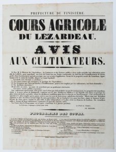 FINISTÈRE. 1859. «COURS AGRICOLE DU LÉZARDEAU. Avis aux Cultivateurs du programme des cours (Agriculture, Botanique fourragère, Horticulture, Irrigation). «Enseignement agricole pratique avec un terrain d'application, formé de la propriété rurale du Lézardeau, appartenant à Mr le Comte de COU?DIC Député au Corps Législatif.» Charles RICHARD Préfet du Finistère, à QUIMPER le 12 Décembre 1859.
