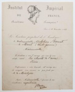 PRIX MONTYON de Littérature. INSTITUT IMPÉRIAL DE FRANCE. Académie Française Paris 12 Décembre 1864. Lettre signée Abel François VILLEMAIN (1790-1870) Écrivain et Homme Politique, en tant que Secrétaire Perpétuel de l'Académie Française. A mademoiselle Adolphine BONNET, à MURET (Haute-Garonne). Réception de son ouvrage de poésies intitulé «Les Chants de l'âme» pour concourir au prix fondé par Mr MONTYON. 1p in-4° avec en-tête de l'institut.