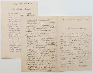 Lettre A.S., POUL-AR-FEUNTEUN (29) 18 juin 1886, à l'Amiral Mouchez; 4 pages in-8. Il ne se fait pas illusion quant à son élection à l'Académie des sciences: «du moment que la section, soit d'astronomie soit de navigation, qui veut bien me présenter, ne me met pas en 1ère ligne, je suis bien sûr de ne pas être nommé [...] Tu me dis que tu penses que pour la prochaine élection on me mettra en 1ère ligne, espérons que tu seras bon prophète !»... Il parle du pauvre Martinez, puis du fils de Mouchez Charles qu'il a trouvé très bien, et un «charmant garçon [...] cela fera un bon officier de marine !»... + Lettre A.S. de l'astronome Félix TISSERAND à l'Amiral Mouchez (8 décembre 1885), au sujet de procès-verbaux de séances.