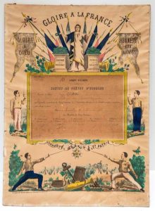 ESCRIME 1888. Brevet de PRÉVÔT D'ESCRIME accordé au Sieur CUNNAC Soldat de 2ème Classe au 100ème régiment d'Infanterie. 16ème Corps D'Armée. Fait à MONTPELLIER (34) le 8 Décembre 1888. Pièce signée du Jury d'examen composer de 3 Maîtres d'Escrime, un lieutenant et un Capitaine.