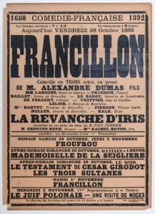 Affiche de la Représentation du 28 Octobre 1892 de «FRANCILLON» Comédie en 3 Actes, en prose, de Mr Alexandre DUMAS Fils.