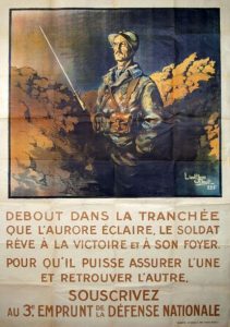«DEBOUT DANS LA TRANCHÉE que l'aurore éclaire, le soldat rêve à la Victoire et à son foyer. Pour qu'il puisse assurer l'une et retrouver l'autre, souscrivez au 3ème EMPRUNT.»