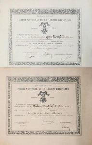 Diplôme de Chevalier de la Légion d'Honneur décerné à Félix QUIR-MONTFOLLET, Capitaine au 35ème Régiment d'Aviation. Fait à Paris le 9 Juillet 1924. Griffe de Gaston DOUMERGUE. Papier (56 x 44) + Diplôme d'Officier de la Légion d'Honneur décerné au Lieutenant-colonel de l'Armée de l'Air Félix QUIR-MONTFOLLET. Fait à Paris le 21 Juin 1939. Griffe du président Albert LEBRUN. Papier (43 x 53 cm)