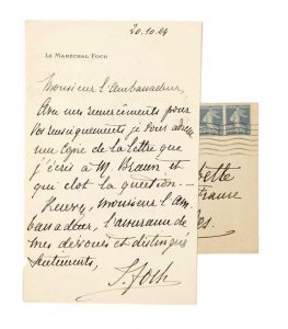 Lettre A.S. à l'en-tête «Le Maréchal FOCH» du 20 octobre 1924 - 1p in-8° - Il remercie un ambassadeur pour ses renseignements.