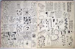 général 20 à 40 par page dans des cases quadrillées, mais aussi des compositions uniques), au bic noir ou bleu, parfois avec mélanges de couleurs, certains annotés de chiffres, de dates. À noter : 2 cahiers pour mars 1962 dont un déchiré puis recollé au papier collant), - +/- 750 dessins au bic collés sur des feuilles A4 de récupération à en-tête "Immobilier COVA" ou de rapports immobiliers ou techniques (13 avec 1 dessin, 21 avec 2 dessins, 35 avec 3 dessins et 153 avec 4 dessins), souvent avec mentions de date et/ou de dimensions de futurs panneaux, parfois nom et prix de l'acheteur ("vendu pour 250 fr à Troch le 3.10.60 dans un moment pénible !" ou ""La mine", vendu [?] Destré février 61 - 10.000 frs 122/122 doré, n° 34"), plusieurs avec mentions non élucidées, parfois mention d'exposition "Ce panneau a été exposé à la Madeleine rue St-Jean en sept. 60" etc., - près de 2.000 petits dessins sur +/- 70 ff. ou bifolios (dessins alignés dans des cases ou collés sur des ff.), - 1 aquarelle non signée (15 x 15 cm), 1 dessin à l'encre de Chine (12 x 17 "À ma femme. Rem. Janvier 1957", taches et 1 coin coupé), 1 dessin aux crayons gras noir et jaune (18 x 13 cm), - 10 grandes photos en noir par H. Colson à Uccle, de panneaux réalisés par l'artiste et 7 de dessins de l'artiste (plusieurs avec certification de l'oeuvre par la veuve de l'artiste), - Expositions, etc. : LECOMTE, Marcel.- Univers et signes de Rem. (Brux., Éd. desArtistes, 1957), in-12° en ff. sous chemise d'éd. (abïmée).— Exposition Galerie Sisley à Brux., janvier 1958, bifolio in-16°.— Invitation expo Galerie La PRoue, 1960.— Europa, 1959. Numéro 5 de cette revue illustrée de dessins de Rem.