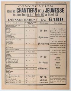«Département du GARD» - «Convocation dans les CHANTIERS DE LA JEUNESSE des jeunes gens nés du 1er Avril 1923 au 30 avril 1923» au Chantier de Jeunesse N°19 AGUESSAC (Aveyron) , N° 23, ST-PONS (Hérault) & N° 25, LUNAS (Hérault) - du 15 Avril 1943 - Impr. de la Charité- Montpellier (Pierre-Rouge) - Affiche (64 x 50) État A