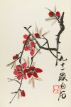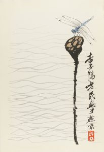 lám. en acordeón, enc. en seda decorada, lomera en piel, puntas rozadas. Qui Baishi (1864-1957) fue un célebre artista chino, su carrera como retratista y pintor de escenas costumbristas empezó en su hogar. Cuando tenía 40 años viajó por primera vez por China y visitó los paisajes famosos de Hubei, Shaanxi, Hebei, Jiangxi, Guangdong y Guangxi. En 1917 se trasladó a Pekín, donde alcanzó la fama. En 1953 fue nombrado presidente de la Asamblea de Pintores Chinos y la Asamblea Popular Nacional. En 1955 el Consejo Mundial de la Paz le galardonó con el Premio Internacional de la Paz. Sus pinturas muestran su habilidad para representar las cosas mediante estructuras simples trazadas con rápidas y habilidosas pinceladas. Los temas preferidos de Qi fueron los paisajes, las escenas agrarias y sobre todo pequeñas criaturas como cangrejos y otros crustáceos, renacuajos, ratones, pájaros e insectos, así como plantas como peonias, lotos y bananos.