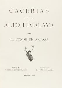 .1959.. LIBRO: .(CAZA).. .ARTAZA, CONDE DE:. .CACERIAS EN EL ALTO HIMALAYA.. Prólogo de Antonio Botin Polanco. Madrid: Grafs. Reunidas-Grafs. Solana, 1959. 4º mayor. 372 p. + 2 h. Profus. ilustr. en el texto, 2 lám. a doble página en color y un...