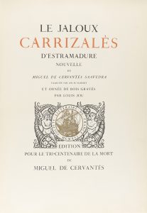 .1916.. LIBRO: .(BIBLIOFILIA-CERVANTINA).. .CERVANTES SAAVEDRA, MIGUEL DE:. .LE JALOUX CARRIZALÈS D´ESTRAMADURE NOUVELLE DE.... Édition pour le tri-centenaire de la mort de Miguel de Cervantès. Traduit par Louis Viardot et ornée de bois gravés...