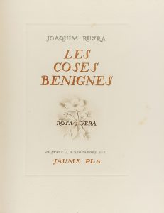 .1935.. LIBRO: .(BIBLIOFILIA).. .RUYRA, JOAQUIM:.. .LES COSES BENIGNES.. Barcelona: Rosa Vera, 1935. 4º menor. 91 p. + 1 h. Puntos de óxido. Ilustr. con aguafuertes de Jaume Pla. Edición numerada de 150 ejemplares en papel de hilo con firma del...