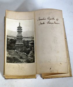 Dans un album ad hoc in-16°, plats couverts de tissu, étiq. sur le plat sup. Monuments et lieux touristiques : Palais d'été (6 photos), Cité interdite (6), Palais d'hiver (3), temples divers (10), grande muraille (3), tombeaux Ming (3), pagodes (2). Scènes populaires : transport en cariole, diseur de bonne aventure, barbier, broyage du grain, bucheron, éboueur, restaurant de rue, rue Chien Men, processions de mariage (2) ou funérailles (3)... fl 48 original photos of Beijing : monuments and tourist places (Summer Palace, Forbidden City, temples, Great Wall...) and everyday life (barber, street retstaurant, wedding processions, funerals...).
