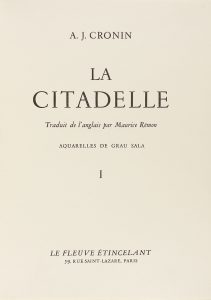 .1950 ca.. LIBRO: .(ARTE-BIBLIOFILIA).. .CRONIN; GRAU SALA [ilustr.]:. .LA CITADELLE. Traduit de l´anglais par Maurice Rémon.. Paris: Le fleuve étincelant, 1950 ca. 2 vol. en 4º mayor. I: 364 p. + 2 h. II: 336 p. + 4 h. Bellamente ilustrado por...
