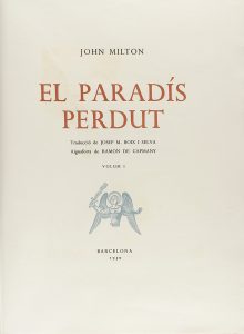 .1950-1951.. LIBRO: .(BIBLIOFILIA).. .MILTON, JOHN; CAPMANY [ilustrador]:.. .EL PARADIS PERDUT. Trad. de Josep. M. Boix i Selva.. Barcelona: SADAG, 1950-51. 2 vol. en 4º mayor. I: 240 p. + 2 h. II: 226 p. + 4 h. Ilustr. con 14 aguafuertes por Ramon...