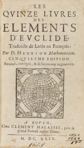 .1649.. LIBRO: .(MATEMATICAS-GEOMETRÍA).. .EUCLIDES:. .LES QUINZE LIVRES DES ELEMENTS D´EUCLIDE. Traduits de Latin en François par D. Henrion.... Rouen: Clement Malassis, 1649. 8º. 4 h. + 1219 p. Portada con xilografía tipográfica. Ilustr....