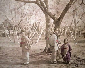du Hongan-ji à Kyoto,- 1 entrée de temple avec personnages,- femmes dans un verger,- pagode. fl 12 larges photos (3 slightly heightened) stuck on thicker blue paper figuring the Shinto Temple (Nikko), the Nigatsu-do (Nara), the entrance of the Hongan-ji (Kyoto), an entrance of a temple with characters, women in an orchard and a pagoda.