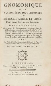 .1773.. LIBRO: .(GNOMÓNICA).. .GARNIER, JOSEPH-BLAISE:. .GNOMONIQUE MISE A LA PORTEE DE TOUT DE MONDE OU METHODE SIMPLE ET AISEE POUR TRACER DES CARDANS SOLAIRES, dans laquelle on trouvera des Tables calculées.... Marseille: Chez Jean Mossy, 1773....