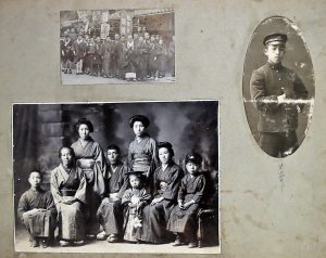 plusieurs épreuves et collées dans des albums différents, quelques coupures de journaux collées dans les albums). Photos de famille posant souvent en habit traditionnel : mariage, naissances, enfants, funérailles au temple shinto à Tokyo, groupes d'écoliers ou d'écolières, représentation de théâtre No, femmes en yukata (kimono d'été) dans des sources thermales, etc. En filigrane, témoignage de la guerre sino-japonaise en 1938-1939 et en Birmanie via de nombreuses photos de jeunes gens en uniforme, photos de départ, à la caserne (à Himeji), groupes de recrues envoyées dans le nord de la Chine (photo avec chapka), photos dans les réfectoires, sur un bateau de guerre (avec activités diverses : bain, lutte de sumo, groupes de marins, scaphandre, etc.), navires de guerre, le général Tsutsumi Misao, Hiroshi Matsushima, port de Tateyama... Avec quelques coupures de presses relatives aux casernes japonaises en Chine près de la Corée et les avis de décès de quelques soldats. Quelques cartes-photos achetées avec chants nationaux... Quelques photos de groupe en 1953 et 1954, dans divers lieux (temples, cimetières) et villes, suite aux réunions des familles de victimes de la guerre. Joint : Album de +/- 230 photos dont 14 relatives à la guerre (photo de prisonniers chinois, d'avion), sinon familles d'Européens à la patinoire ou à la plage, scènes de cabaret... avec quelques photos d'Européennes habillées à la chinoise (une photo couleurs année '40 avec cachet sec "Mei Lee Photo / Tsingtao [i.e. Quingdao] China"), et des vues de Hong Kong (?). fl 5 albums containing +/- 830 black photos (several with Japanese legends), showing the life of a Japanese family in the years 1935-1955. Testimony of the Second Sino-Japanese war in 1938-1939 and in Burma (young men in uniforms, warships, Tsutsumi Miaso, Hiroshi Matsushima...). Album with +/- 230 photos (14 related to the war) of Europeans joined.