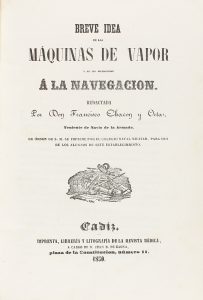 .1850.. LIBRO: .(INDUSTRIA-ENCUADERNACIÓN).. .CHACON Y ORTA, FRANCISCO:. .BREVE IDEA DE LAS MÁQUINAS DE VAPOR Y DE SUS APLICACIONES Á LA NAVEGACIÓN.. Cádiz: Imp. Revista Médica, 1850. 4º menor. 160 p. Ilustr. con numerosos grabados en el texto...
