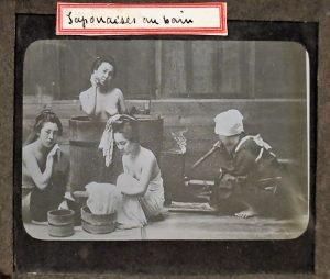de marchand, au jardin public, au temple...— NIKKO (9) : Site du temple shinto à Nikko (8). — KAMAKURA (1 photo) : Daibutsu ou Grand Boudha.— SCÈNES QUOTIDIENNES (20 photos) : en promenade en ville, paysans dans les champs, maison de thé, vue sur la mer, rizières, Fujiyama, badauds, jinrikisha (pousse-pousse), lit japonais, joueuses de samisen et koto, geishas dansant, funérailles, Japonaises au bain, porteurs de palanque... et une photo d'un Européen à moustache posant en kimono ! Joint : 26 négatifs tirés sur verre, même dimension. Ens. 6 boïtes. fl 38 photos on glass figuring Yokohama (public garden, temple...), Nikko (Shinto Temple), Kamakura (Daibustu) and various scenes of everyday life (farmers in fields, tea house, Fujiyama...). With 26 negatives on glass joined.