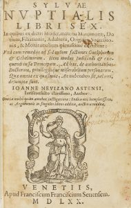 .1570.. LIBRO: .(DERECHO CANÓNICO).. .NEVIZANO ASTENSII, IOANNE:. .SYLUAE NUPTIALIS LIBRI SEX.. Venetiis: Apud Franciscum Senensem, 1570. 2 vol. en 8º moenor. Vol. I: 18 h. + 288 p. Vol. II: 696 p. Portada remarginada con grabado tipográfico,...