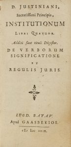 .1669.. LIBRO: .(DERECHO).. .JUSTINIANI:. .SACRATISSIMI PRINCIPIS, INSTITUTIONUM... DE VERBORUM SIGNIFICATIONE ET REGULIS JURIS.. Lugd. Batav. : Apud Gaasbekios, 1669. 12º estrecho. Portada grabada + 652 p. + 19 h. + 1 estado plegado. Hojas de...