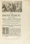 .1697.. LIBRO: .(DERECHO).. .[DOMAT:].. .LE DROIT PUBLIC SUITE DES LOIX CIVILES DANS LEUR ORDRE NATUREL TOME IV.. Paris: Chez Jean Baptiste Coignard, 1697. 4º. 36 h. + 555 p. Portada con grabado, ilustr. con bellas cabeceras y capitales...