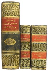 1845. 8º mayor. 1079 p. [Más:] .ID.: GUIA DE LA HACIENDA PÚBLICA. PARTE LEGISLATIVA DE 1844. .Id. 8º menor. 592 p. Estados plegados. [Más:]. ID. GUIA... 1845. .960 p. Con estados plegados. Tres obras enc. cada una en plena piel con ruedas y cantos dorados, lomeras cuajadas, tejuelos y cortes jaspeados. Tres obras jurídicas con encuadernación similar.