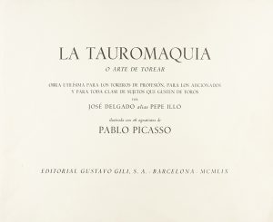 Cometa, 1980. Folio apaisado. 142 p. y 26 reproducciones de las aguatintas firmadas de Picasso presentadas en suite. En rama, petaca de tela. Edición numerada de 1500 ejemplares. Se trata del facsímil de la obra que Gustavo Gili publicó en 1959. A finales de los años cincuenta Picasso asistió a una corrida de toros de Arles y allí realizó las ilustraciones para este libro.
