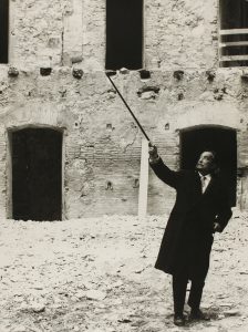 .1955 ca.. FOTOGRAFÍA: .SABATER, ENRIQUE:. .RETRATO DE SALVADOR DALÍ EN EL TEATRO PRINCIPAL CUANDO EL MUSEO ESTABA EN PROYECTO.. 24 x 18 cm. La imagen lleva sello húmedo de Sabater al dorso.