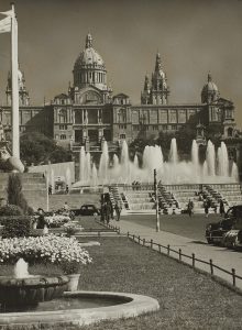 Palacio Nacional y las fuentes de Montjuich y al dorso sello húmedo de A. Campañá y J. Puig Farrán.