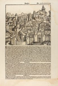 xilográficos de 20 x 22 cm aprox. cada uno. Presentados en paspartú. El folio LXXI: ´Quinta etas mundi´ contiene en recto 5 viñetas xilográficas y texto en latín; en verso la xilografía de Tolosa. Anotación de anterior poseedor al margen. El folio CCLXXXVIIIII incluye los grabados de Anglia en recto y de Hispania en verso, acompañados del texto en latín. Restauración del margen inferior, antiguo cerco de humedad en la punta superior derecha. Ambos forman parte del incunable ´Liber Chronicarum´; sus grabados fueron realizados por Wolgemuth, célebre grabador y maestro de Durero.