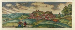 .1560-1590 ca.. GRABADO: .(GRABADOS).. .HOEFNAGLE, GEORGIUS:. .2 GRABADOS DE VISTAS DE LEBRIJA Y VEJER. CIVITATES ORBIS TERRARUM.. Grabados al cobre y uno coloreado de época, 18 x 45 cm y 17 x 49 cm. Ambos con el pliego central restaurado.